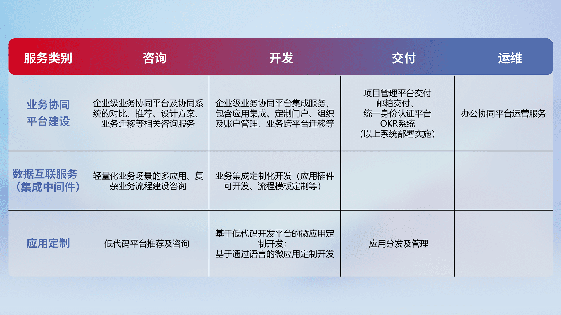 针对钉钉、、、、企微、、IDaas等平台级产品提供产品的规划、、方案、、、交付、、、、定制化开发等服务,,,,实现如统一协同办公、、、智能客户服务、、、混合会议管理、、智能数据查询、、、等业务场景,,,,实现数字化转型。。