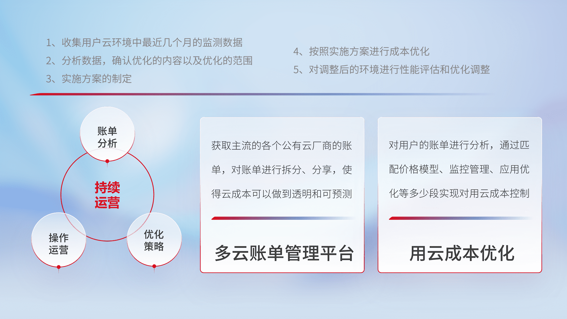 通过多云纳管,,以统一的资源数据模型把客户的云资源进行抽象和封装,,,,进而实现对多云资源的统一操作,,,保障云资源管理的可靠性、、、、稳定性与可用性。。。量身定制化运维内容,,,,配置、、开发运维、、补丁管理、、备份、、监控、、认证和访问管理、、、审计和日常巡检等,,保障在用云过程中的可靠度,,稳定度以及高可用率。。